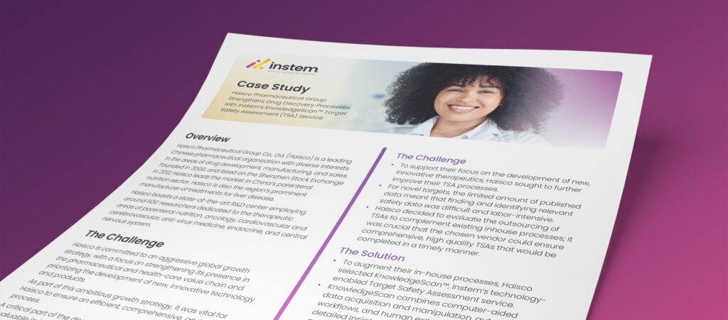 Learn how Haisco has been able to increase Target Safety Assessment (TSA) capacity and throughput plus expedite production with Instem’s KnowledgScan™ TSA service.