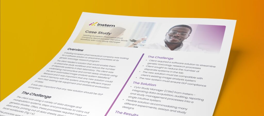 To unify workflows, reduce manual effort, and ensure GLP compliance, a leading European pharmaceutical company implemented Instem’s Cyto Study Manager™ in its genetic toxicology research. Seamlessly integrating with their existing Metafer4/Relosys4 image analysis system, the solution standardized data evaluation, minimized validation overhead, and accelerated study turnaround times while maintaining full regulatory traceability.