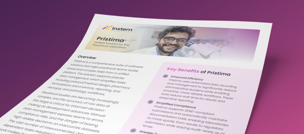 Pristima is a unified, web-based platform that streamlines preclinical research management. With intuitive design, real-time data access, and comprehensive features for study, animal, and pathology management, it boosts efficiency, accelerates decision-making, and reduces administrative tasks.