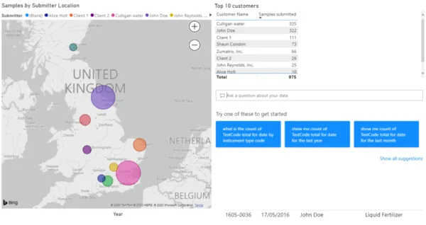 Built-in mapping functions can plot data to zip/post codes. This is useful where you want to highlight the source location of samples, e.g., to map positive results of a test to a location. This can quickly show data as geographic clusters and can be useful in investigative projects. Since PowerBI is being used here, the results are mapped onto a Bing map. Other analytics tools use other mapping applications, but the results would be similar. PowerBI also includes the ability to type in a question about the data, e.g., ‘Show me the count of tests performed by result entry date.’ Power BI interprets this question, pulls the data, and shows it in a relevant format.