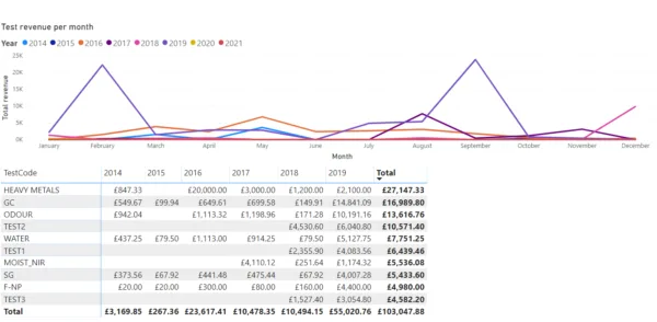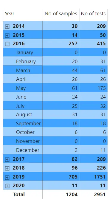 Data can also be shown as simple tables. In this example, the number of samples and the number of tests per year are shown. Note how users can interact with the table by clicking on the year to expand it to show a more detailed monthly view. Users can interact with all graphs, charts, and tables in this way. This can trigger secondary graphs, charts, and tables to update on the dashboard, as you would intuitively expect, ensuring all data in view is relevant.